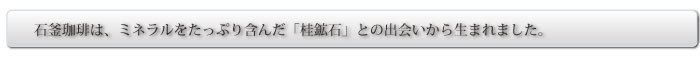 石釜珈琲は、カルシウムや鉄分、ナイアシンを多く含む「桂鉱石」を使い、石の余熱で焙煎されます。 この製法により、短時間でコーヒー豆の水分を蒸発させることが可能になりました。